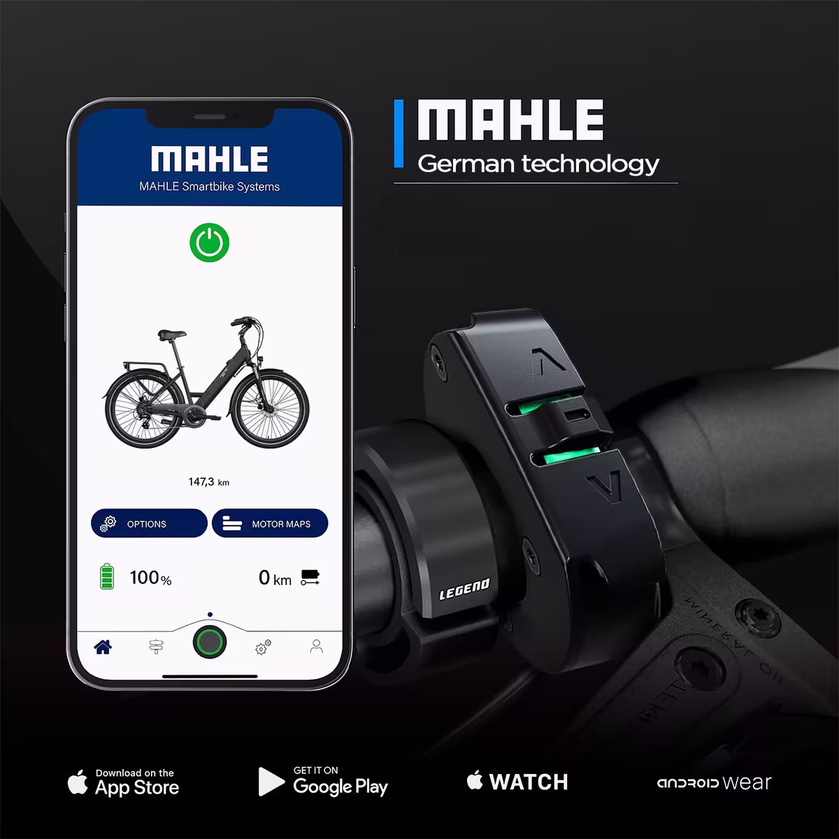 VÉLO CONNECTÉ Avec MAHLE Smartbike®, prenez le contrôle total votre vélo électrique et de l’environnement qui vous entoure. Connectez-vous via Bluetooth à l’application MySmartbike (iOS / Android) pour accéder en temps réel à des informations telles que l’altitude, la vitesse et les calories sur votre smartphone. Cette connectivité s’étend aux moniteurs de fréquence cardiaque et autres Smart devices, incluant le Display MAHLE Pulsar One (vendu séparément).